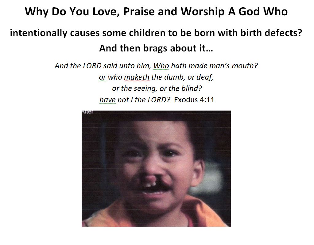 Who but the omnipotent and omnipresent God is responsible for this? In fact, He’s even proud of it and brags about it. But after bragging that He makes deformed people he then prohibits them from coming to the alter: “For any man who has a defect shall not approach: a man blind or lame, who has a marred face or any limb too long” Leviticus 21:18.
